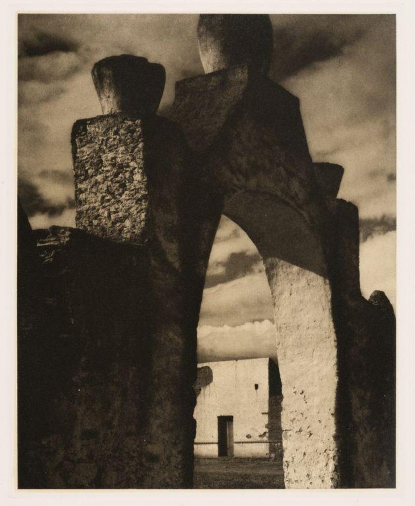 The first image titled “Gateway, Hidalgo” which was taken in 1932 in New Mexico during his invitation. What I enjoy about this image is how Strand has used again an obscure angle to capture the geometry of the architecture in coherence with contrast in textures and lighting. At the forefront of the picture the viewer sees a bold outlines of the wall that is covered in harsh shadow and light setting the mood of abstraction and contrast to further await within the image. When we inspect the image further we begin to notice other contrast in the objects and textures, first being the property that is encompassed into the opening of the wall which powerfully contrasts the darker tones of the forefront as well as geometrically taking on a cleaner cube like structure opposed to curves in the wall. As well we notice the clouds that riddle the sky with this bold pattern which further contrasts with the dark texture of rough stone in the wall and the smooth light concrete of the building in the background.